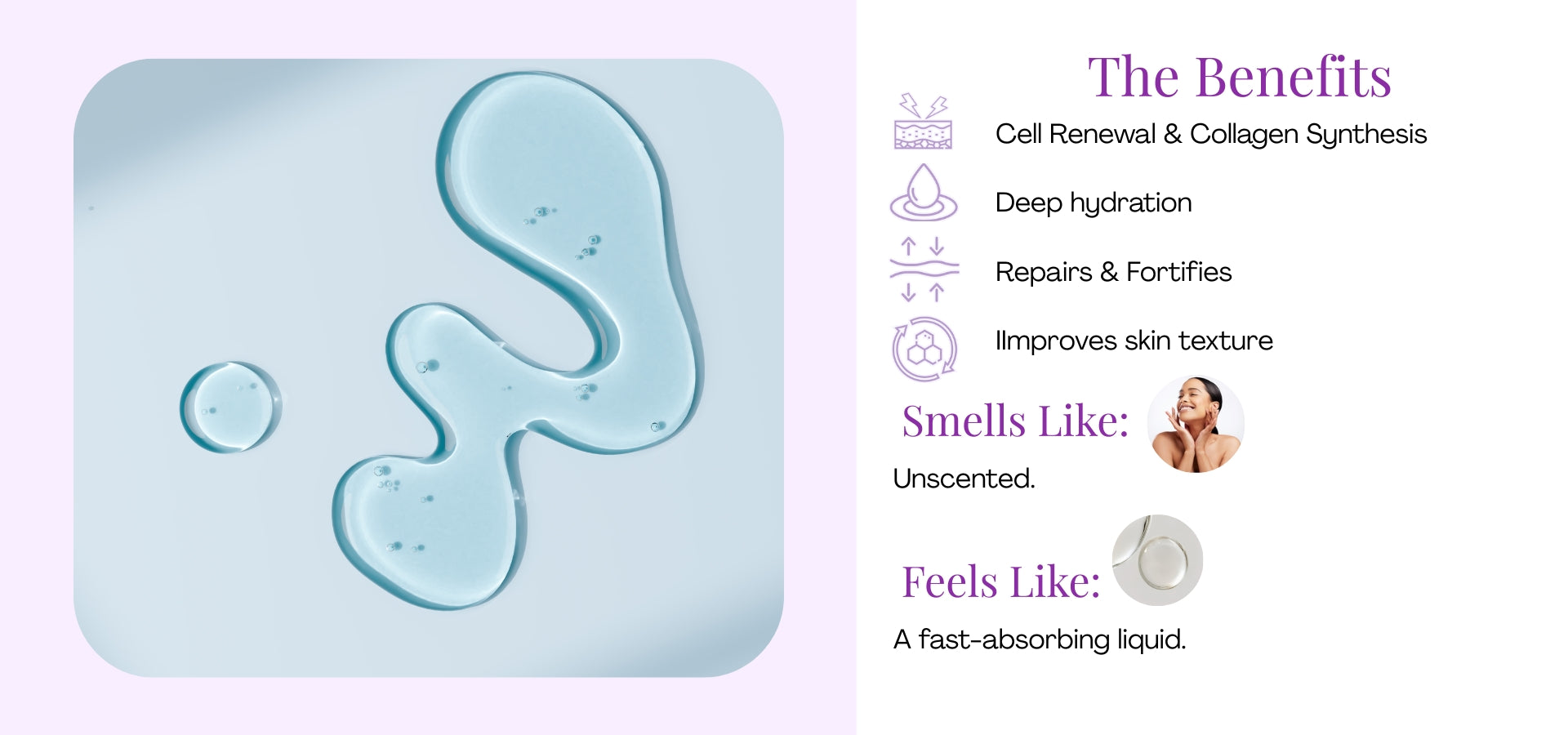 Real dermal renewal (without the injectables!). An oil-free, vegan and ocean friendly serum that has been clinically engineered to visibly restore firmness, deeply hydrate, and powerfully reignite your skin's natural, ageless glow without heaviness or any sticky residue.